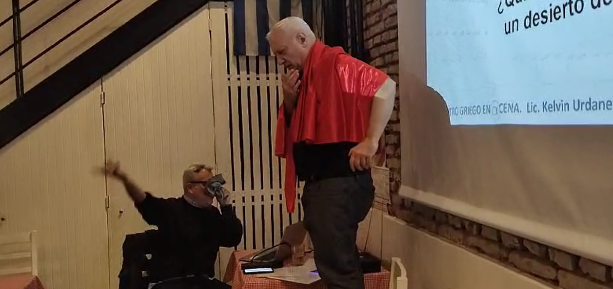 en el rol del Coro clásico y él y otro actor recitando en griego y en